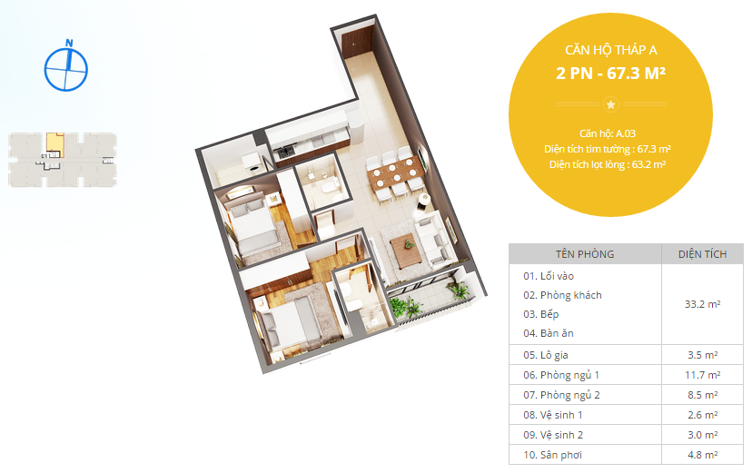 - Căn 02 phòng ngủ: 65 m2- 73.5m2