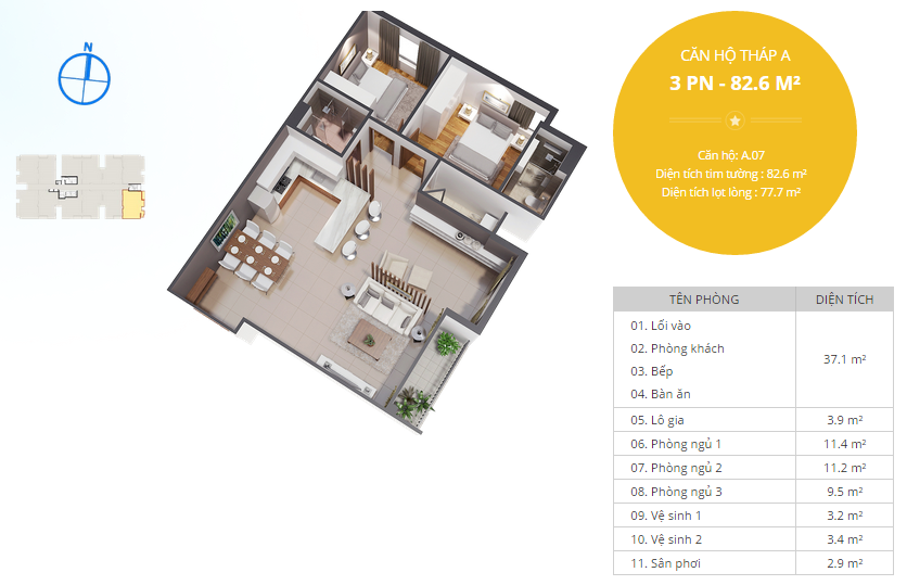 - Căn 03 phòng ngủ: 82.6m2- 85.2m2
